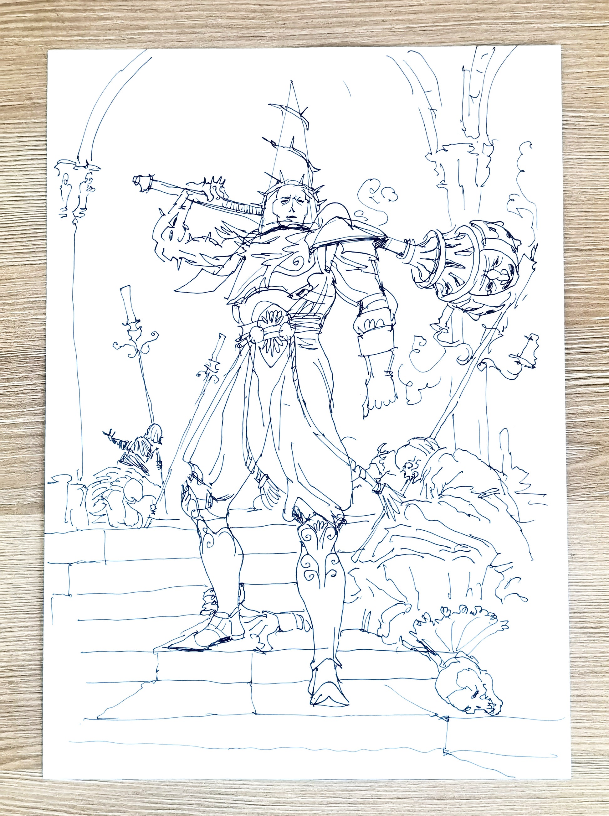 This is a black ink pen drawing on paper. On this series of drawings I take an spontaneous aproach, no underdrawing. I'm inspired by the drawing technique of the Old masters such as Goya or Rembrandt. I look back on my work for Blasphemous and revisit some of the characters one more time.