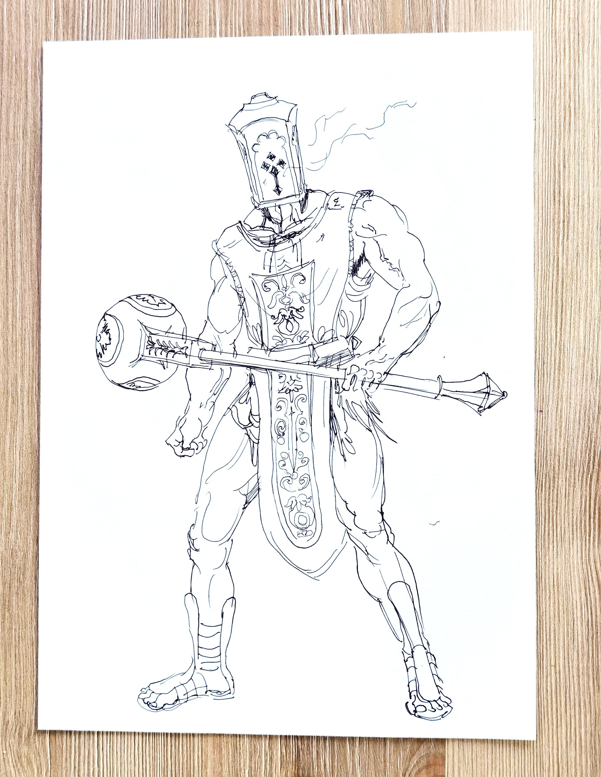 This is a black ink pen drawing on paper. On this series of drawings I take an spontaneous aproach, no underdrawing. I'm inspired by the drawing technique of the Old masters such as Goya or Rembrandt. I look back on my work for Blasphemous and revisit some of the characters one more time.