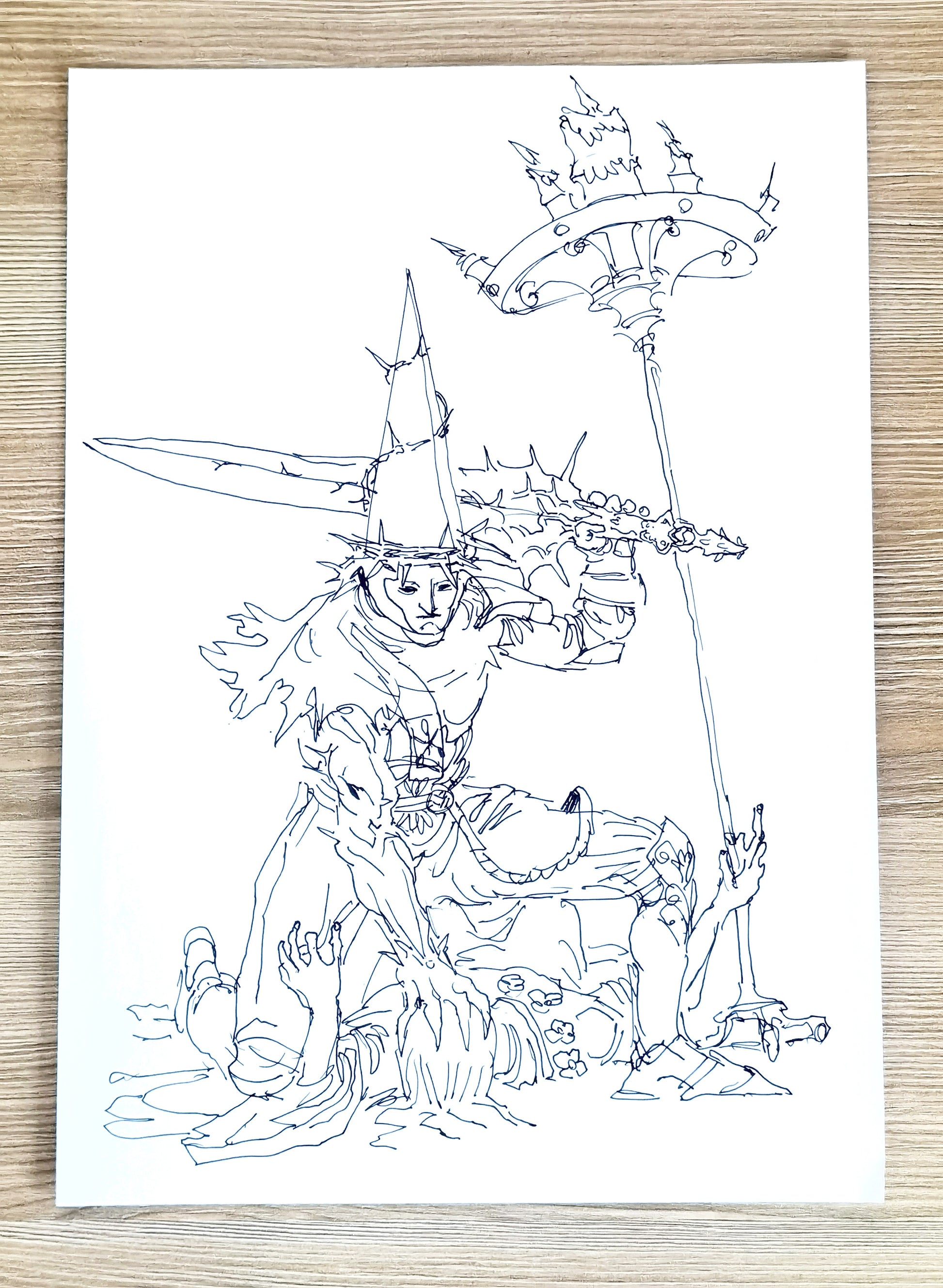 This is a black ink pen drawing on paper. On this series of drawings I take an spontaneous aproach, no underdrawing. I'm inspired by the drawing technique of the Old masters such as Goya or Rembrandt. I look back on my work for Blasphemous and revisit some of the characters one more time.